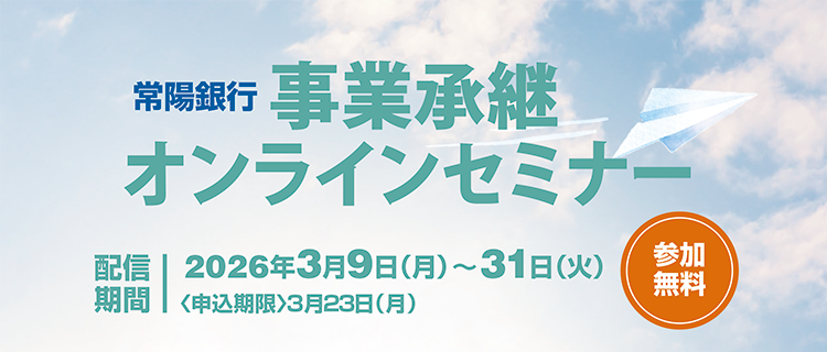 - 個人情報につきましては、株式会社常陽銀行および株式会社常陽産業研究所、常陽コンピューターサービス株式会社が個人情報保護法等の関連諸法令を遵守し、個人情報保護ガイドラインにしたがい適切に取り扱います。ご連絡いただく個人情報は、セミナー運営および関連情報の提供のため使用させていただきます。